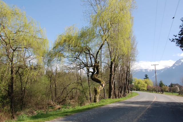 I have turned north on to Campriver Rd., where the road follows the Hope Slough and that’s where I see a lot of ducks swimming in the water. Behind the clouds are the Cascade Mountains. I have made a right onto Ferry Rd. and another right onto Bustin Rd.